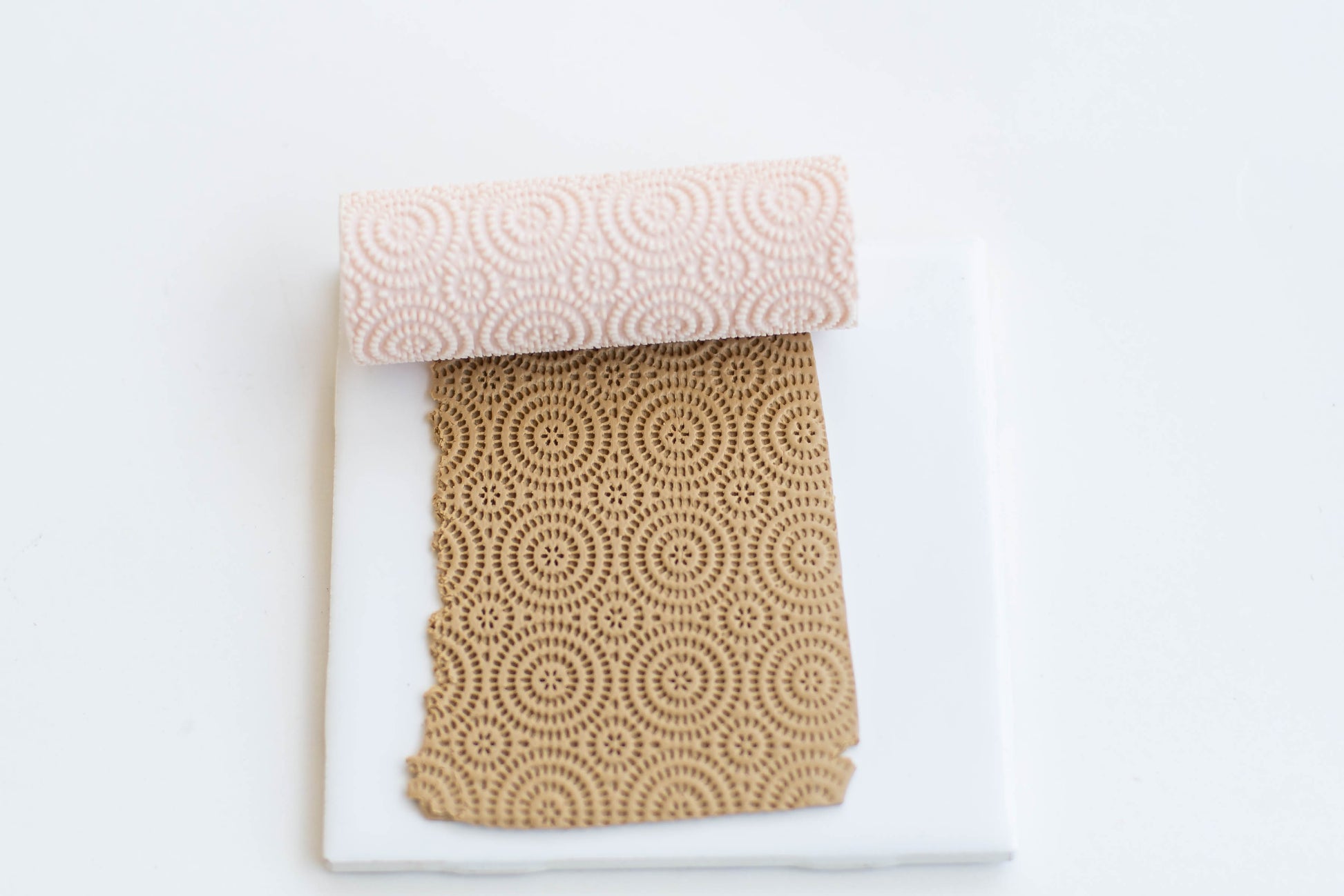 Ensure your clay is not sticky, using firm pressure, roll down your slab of clay to reveal a beautiful texture