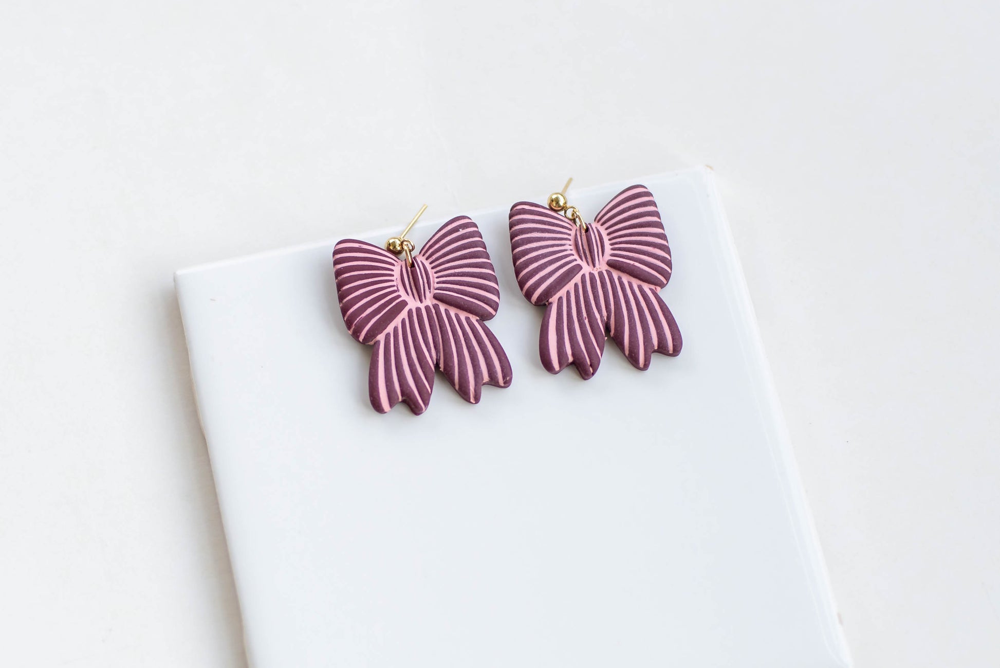 If you are looking for beautiful, lightweight jewelry, then these lined bow earrings will make your day! Our earrings are a perfect addition to any outfit and are lightweight for easy wearing. Our clay is carefully chosen and baked to provide some flexibility, making your earrings more durable. Simple and gorgeous, they provide effortless style.
