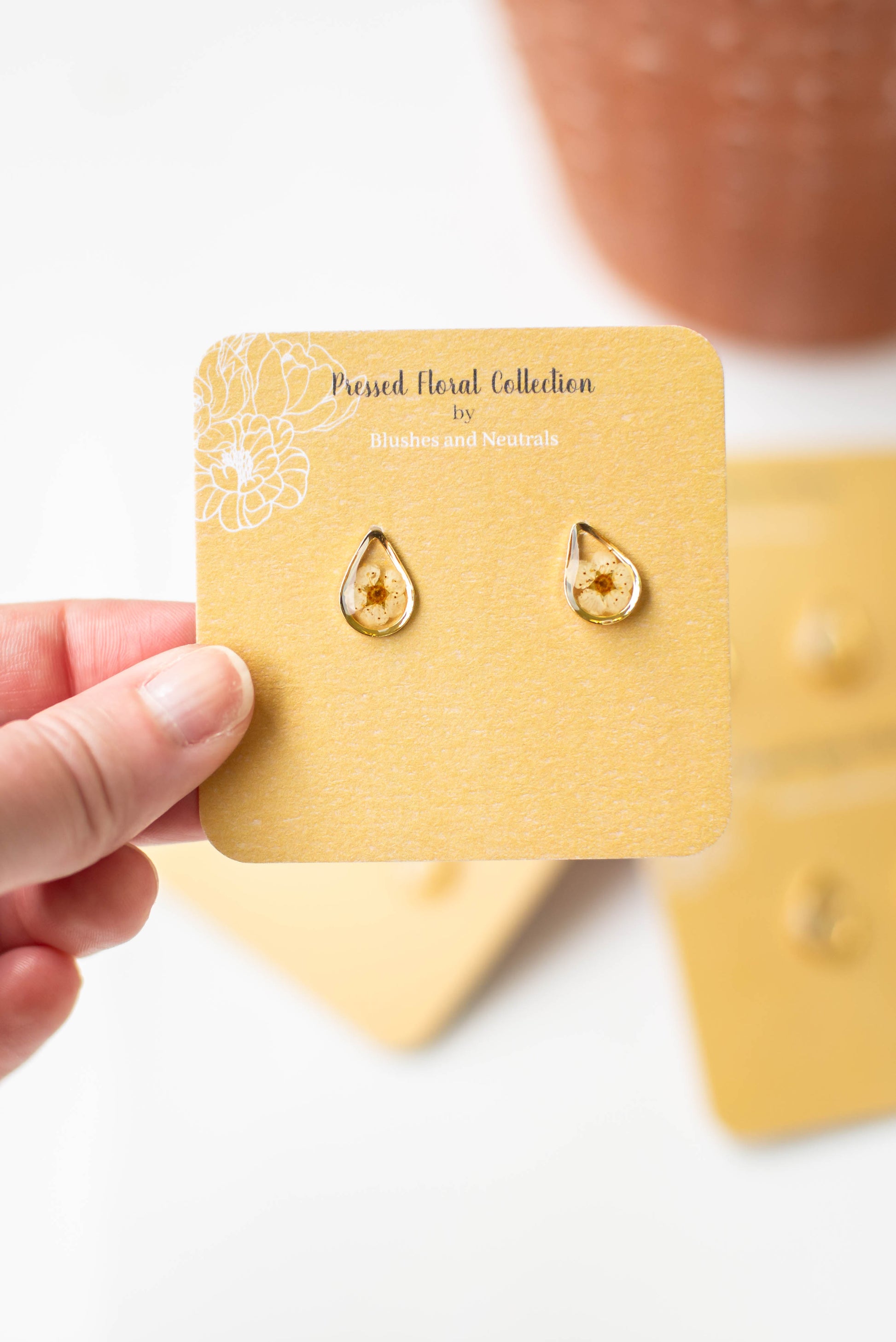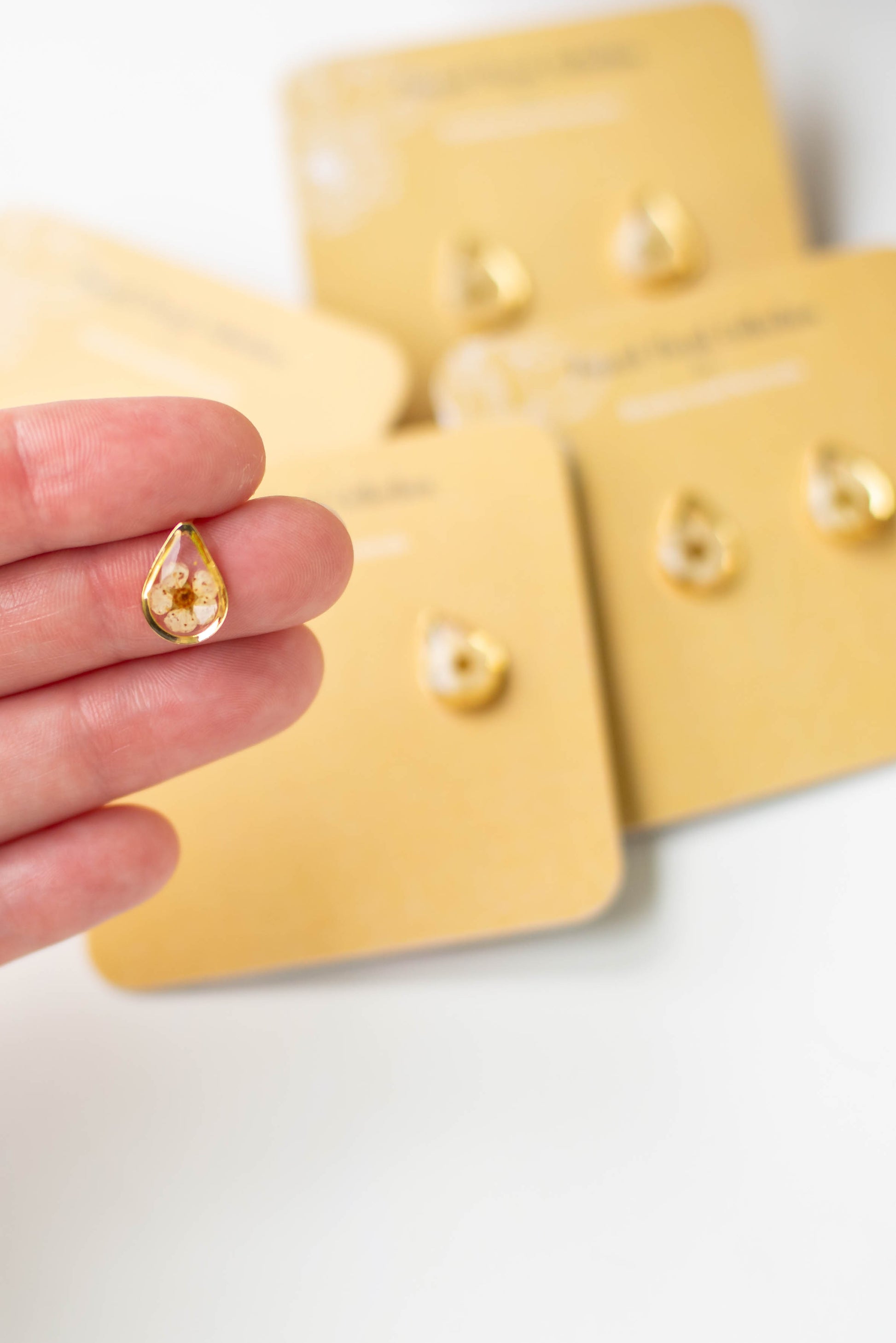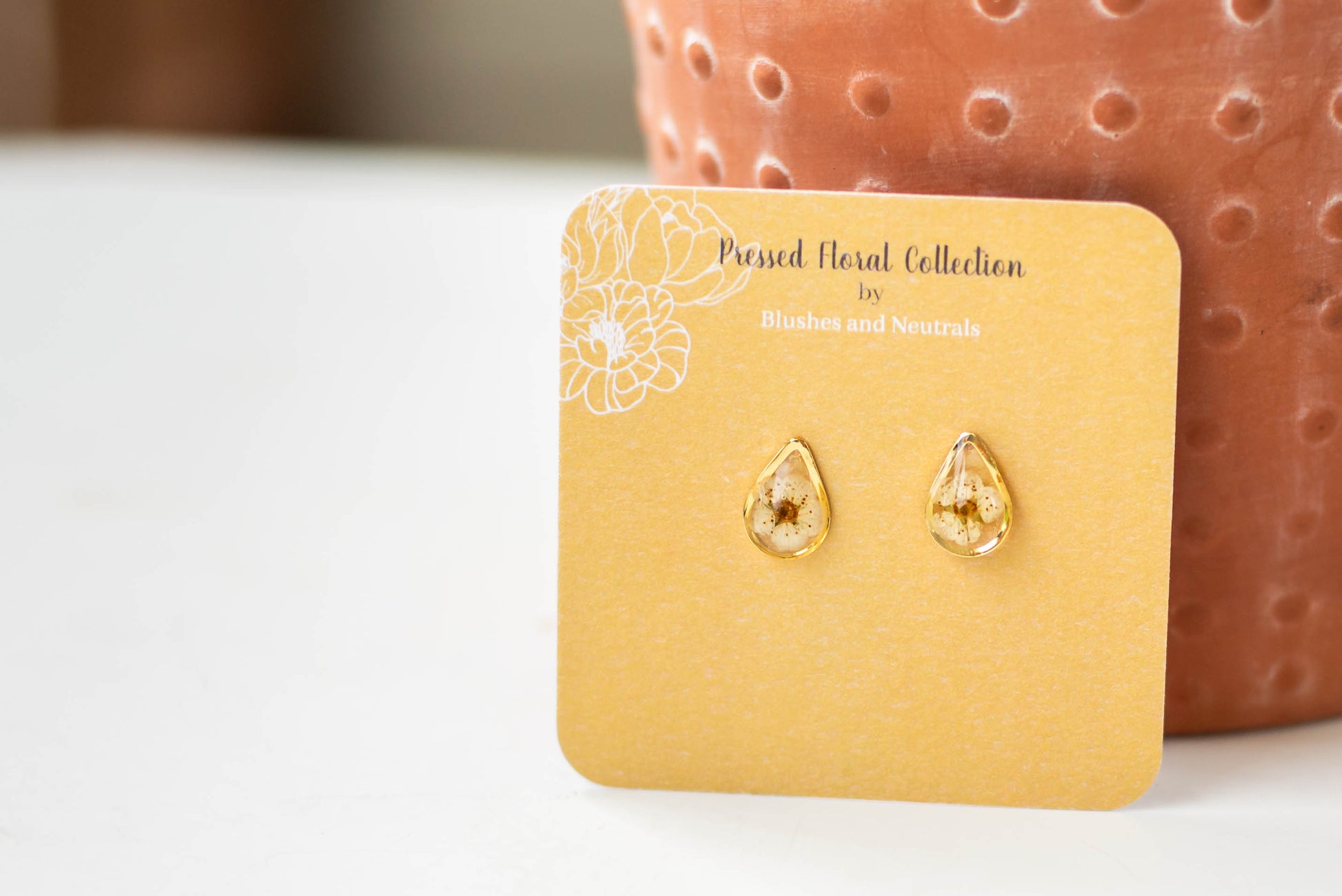 If you are looking for beautiful, lightweight jewelry, and your new favorite studs, these teardrop pressed floral earrings will make your day! Our earrings are a perfect addition to any outfit and are extremely lightweight for easy wearing. Simple and gorgeous, they provide effortless style. Our meticulous attention to detail, handmade process, and high quality-gold plated components, set us apart from other clay earrings.